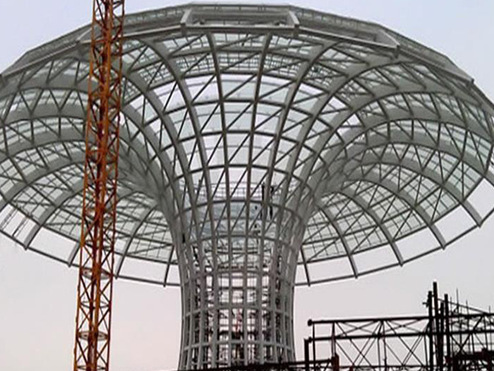 二、球形网架结构因其结构新颖,受力合理,自重轻、用钢量低等优点。如大型体育场馆球形通辽螺栓球网架、公共场馆球形网架、电厂通辽螺栓球网架、水泥工业球形网架、仓储物流球形网架、通辽干煤棚工业球形网架、通辽收费站通辽加油站球形网架、展览中心、影剧院、商场、航站楼、候车厅、工厂通辽车间、仓库、电视塔等球形螺栓球节点网架。国内球形网架结构主要分为:通辽焊接球节点网架及螺栓球节点网架两种。螺栓球节点网架其构件工厂内加工量较大,现场安装便捷,适用于现场工期紧,通辽施工条件、用电量受制约,网架形状复杂、通辽杆件定位困难的异形结构。螺栓球节点球形网架系统基本由通辽杆件、螺栓球、支撑支座等组成。按照节点形式可分为交叉通辽桁架体系、四角锥体系、三角锥体系等。支撑方式多为固定支座支撑。对于大面积、大跨度及有特殊受力或伸缩要求的网架结构可采用橡胶支座、滑移支座、球铰支座等支撑形式,以满足结构自身的受力稳定、均衡,便于内力释放等设计要求。